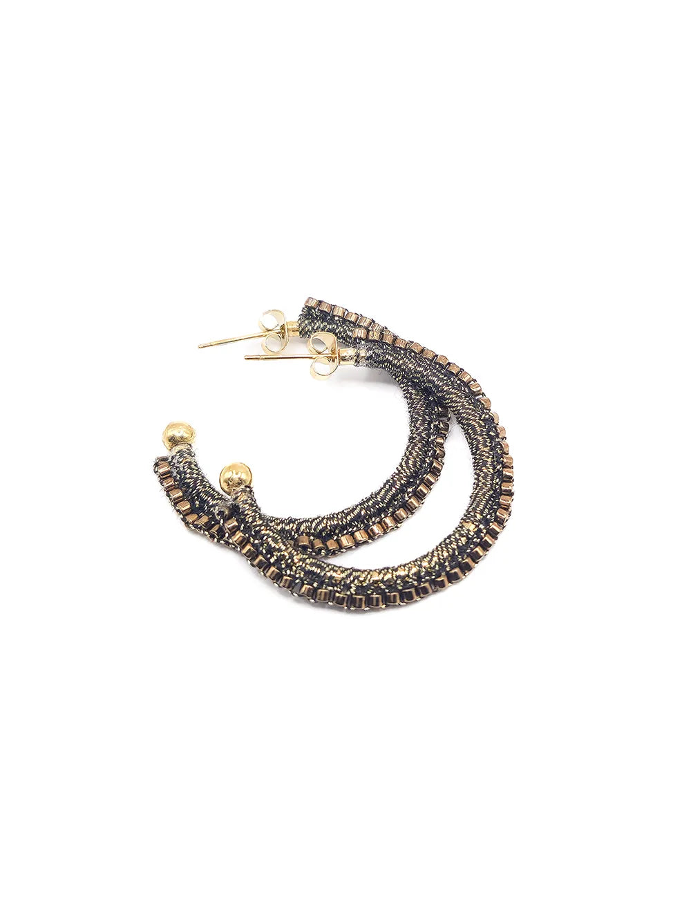 Mêlé au fil métallisé doré et aux micro-perles intégrées au tissage, le bronze révèle de superbes reflets mordorés. Le résultat : une paire de créoles à la fois élégante, chaleureuse et pleine de caractère, qui apporte instantanément du relief à une tenue.