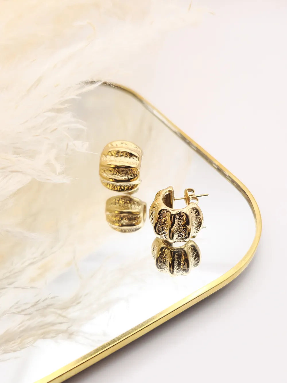 Élégantes et pleines de caractère, ces créoles dorées se distinguent par leur design large et sculptural. Leur surface striée et martelée crée un jeu de reliefs vibrant qui capte la lumière à chaque mouvement, offrant un éclat irrésistible.